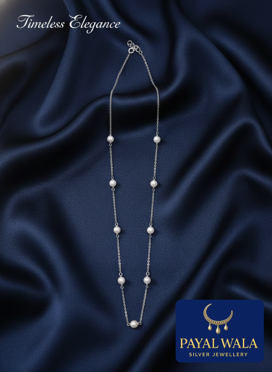 Embrace Timeless Elegance with this exquisite silver station necklace. Featuring delicate sterling silver chain links interspersed with luminous, evenly spaced pearls, this piece offers a modern twist on a classic design. Perfect for everyday wear or layering, it drapes beautifully against the skin and adds a touch of sophisticated grace to any look.