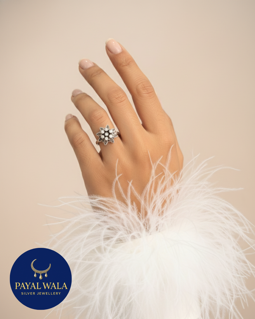 Pair this ring with a delicate silk saree or a modern cocktail dress. Its bold yet feminine silhouette makes it the perfect standalone statement piece, as seen styled here with luxurious feathered cuffs.