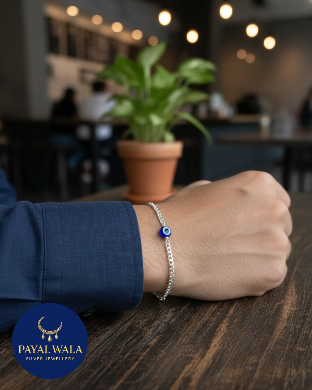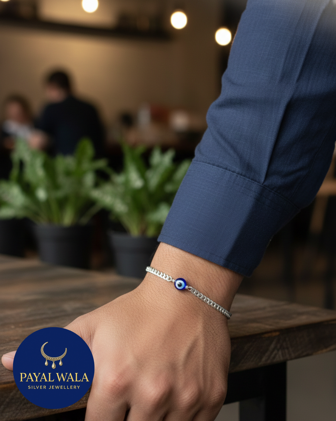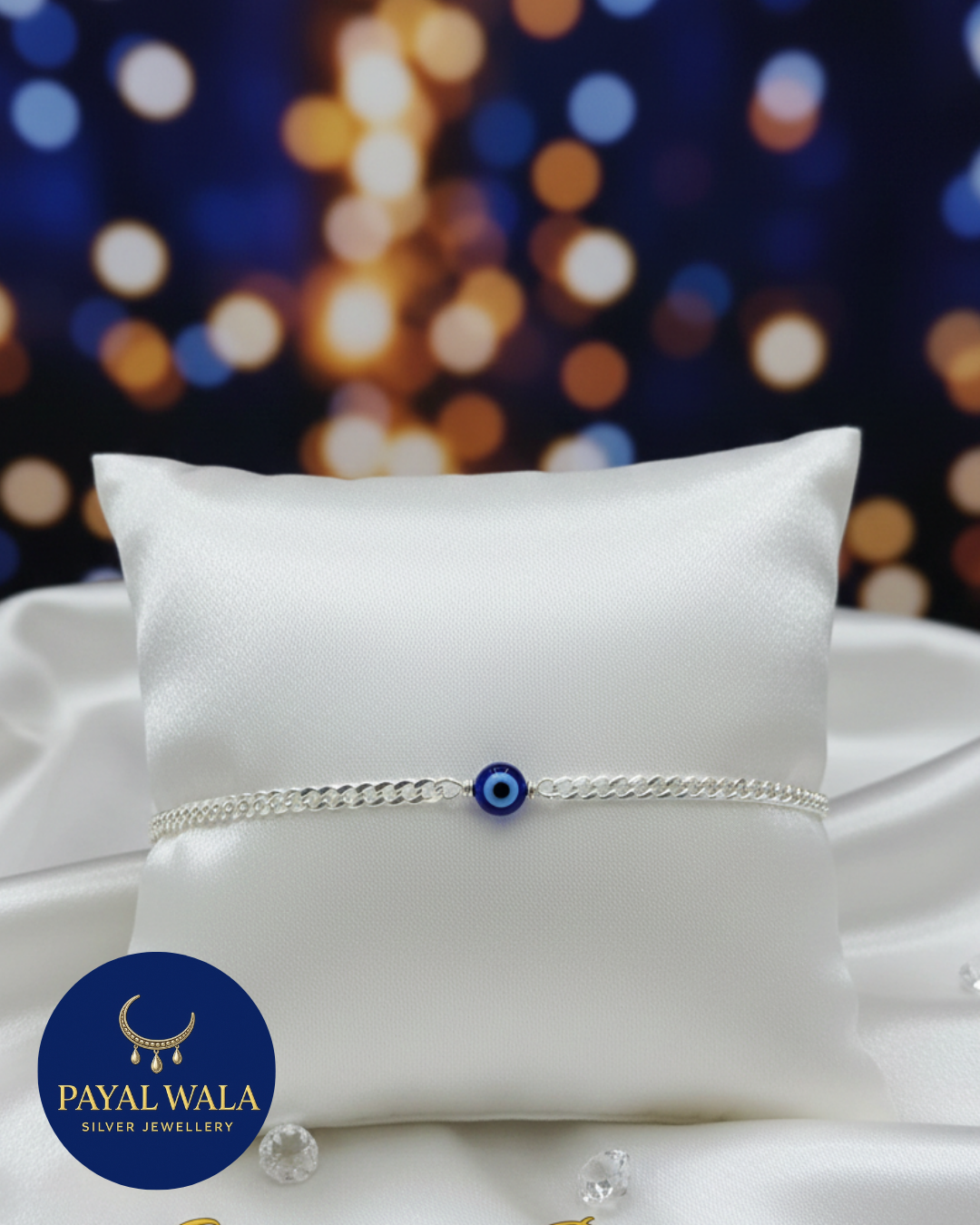 Crafted from high-quality sterling silver, this piece features a classic curb-link chain that offers a comfortable, flexible fit for daily wear. At its center lies a vibrant Evil Eye (Nazar) bead, meticulously set to serve as a bold focal point against the High Finish silver.
