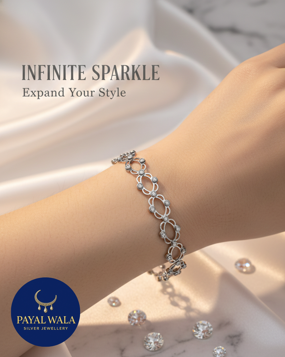 Each intersection of the delicate silver framework is adorned with a brilliant-cut stone, catching the light from every angle to mimic a starry night sky. Whether worn as a statement piece for a gala or a sophisticated accessory for a dinner date, this bracelet is designed for the woman who appreciates fine detail and versatility.