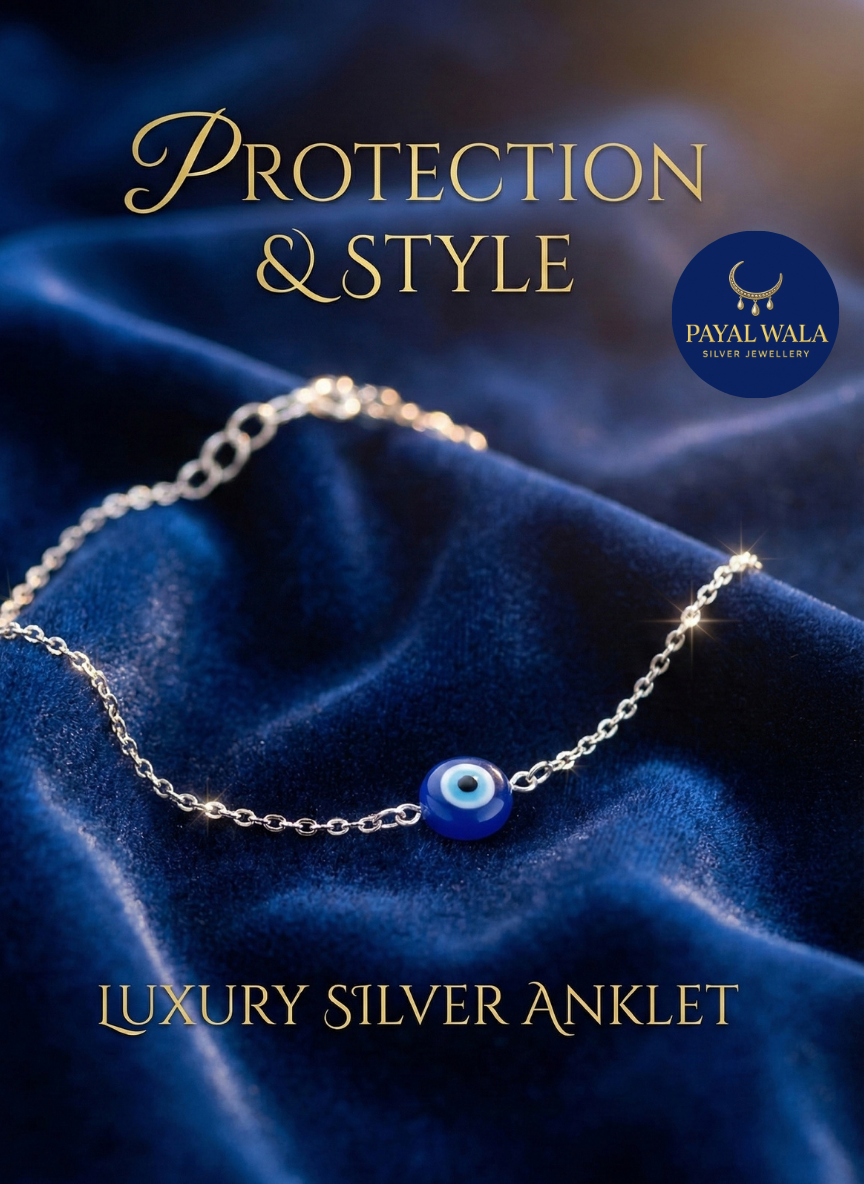 Delicate Evil Eye Charm Anklet. Sterling silver anklet with a prominent blue Evil Eye bead. Perfect for a fashionable, protective accent.