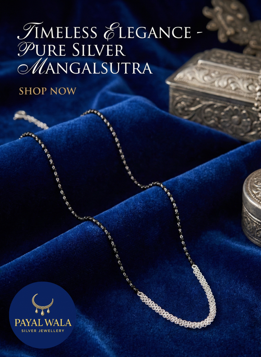 Timeless Elegance Pure Silver Mangalsutra.Embrace tradition with modern style with this exquisite Pure Silver Mangalsutra. This piece beautifully combines the auspicious black beads with a delicate, contemporary sterling silver chain section, offering a look of Timeless Elegance. It is a perfect, lightweight alternative to traditional designs, ideal for daily wear or special occasions.